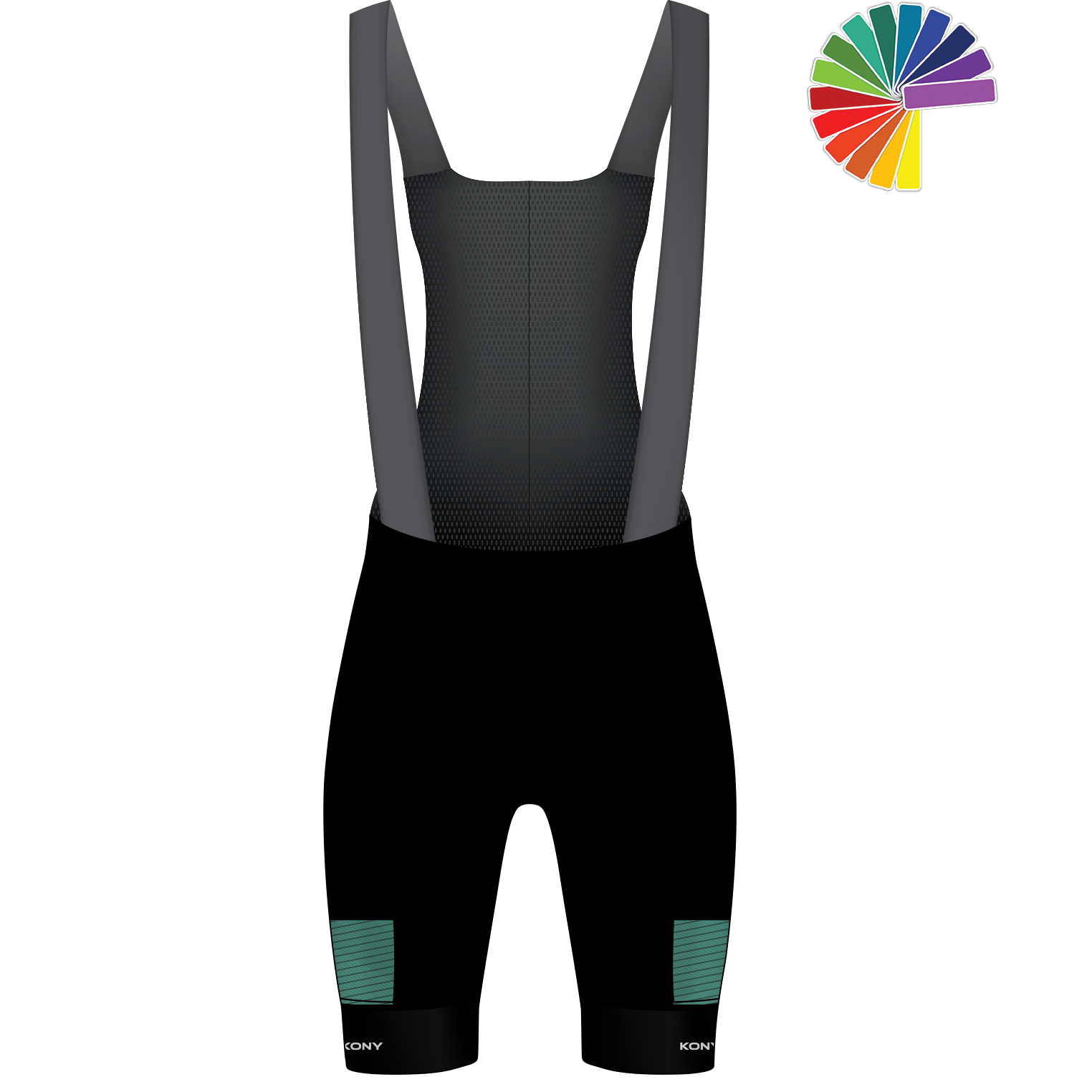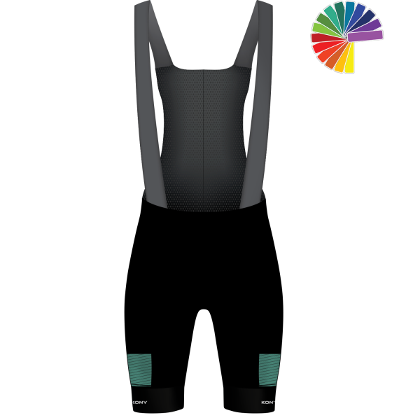 Customize your cycling bib short easily and quickly using the KONY START visual configurator. Create a 100% custom club outfit that proudly displays your team colors and sponsor logos using our online configurator developed in-house. You can also customize your jersey and cycling jacket. Choose from nine base designs to start your customization. Pick the one that best represents your team and let your creativity shine.